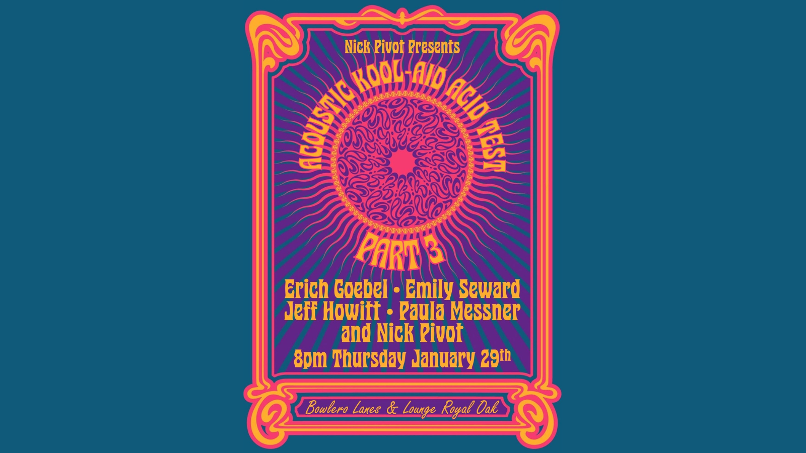 Nick Pivot Presents: Acoustic Kool-Aid Acid Test! Dec 29 Nick Pivot Presents: Acoustic Kool-Aid Acid Test! 8:00 PM - 11:00 PM Free
